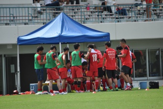 試合が動いたのは前半27分、コーナーキックからゴール前に入れられたボールをキーパー三木と相手FWが交錯、一瞬ファールかと思えたが笛は鳴らずこぼれた所を詰められ先制を許す【0-1】。直後に今年から導入されたクーリングブレイクタイムに入り引き上げてくる選手、動揺はない。切り替えて仕切り直し。