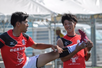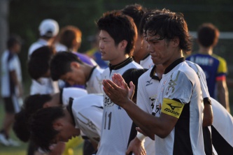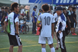 ハーフタイム、選手は暑さで疲れているがやるべき事をやれているので皆集中出来ている。ここで21番藤田に代わり19番岡田が入る。