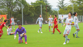 前半20分、19番山領のスルーパスに抜け出した22番河野が冷静に中央へ折り返し、待ち構えていた10番三原が左足でネットを揺らし先制!勢いそのままに相手の攻撃を封じ、1-0で前半を折り返しました。