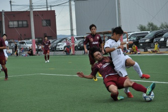 ハイプレシャーを緩めない多度津は42分、ボールを奪った大山から前線の岡田へカウンター、中央の岡田から右サイドを駆け上がった保土へ、フリーの保土から逆サイドの三原に上げられたクロスを三原が中央佐藤へ折り返す、絶好のタイミングで飛び込んできた佐藤が放ったシュートは相手DFにギリギリで防がれゴールならず。追加点が遠い。