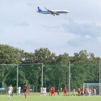 四国リーグ初開催となった完成したばかりの高松市立りんくうスポーツ公園は高松空港の隣ということもあってピッチの上を離着陸する飛行機がひっきりなしに往来する会場。完成したばかりの綺麗な緑のピッチと上を飛ぶ旅客機が相対的でなかなか珍しい。