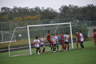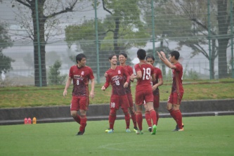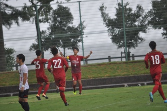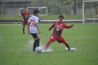 後半、雨脚は強さを増しグランドには水溜まりが増えお互い苦戦するが75分、④黒田慎一郎がCKを直接決め同点に。その後両者最後までゴールを目指すが試合はこのまま2-2の引き分けとなった。
