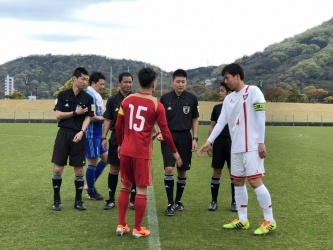 多度津の先発は①GK川尻、DF④黒田、⑥緒方がセンターに入り㉙野村が左㉓福本が右に入る。中盤は②福島、⑧大山、この試合キャプテンを任された⑮中村、㉕赤木、FWに⑩三原とコンビを組むのは㊳浜辺。