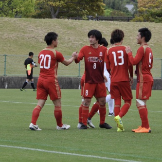幸先良い滑り出しかと思ったが相手の対応も良くなり試合はこう着状態に入る。両者一進一退の攻防がしばらく続いたが前半終了間際の42分、⑬中土井のパスカットから前線の㊳浜辺へ、浜辺は右サイドをドリブルで侵入すると中央⑩三原へパス、エリア手前でボールを受けた三原はここから躊躇なく左足を振り抜くと少しカーブのかかった強烈なシュートがゴール左上角に突き刺さった。⑩三原の均衡を破るミドルシュートで多度津先制【1ー0】