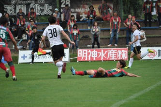 88分、カウンターのチャンス、②福島が相手を背負いながらもボールをキープ、オーバーラップしてきた⑬中土井と繋ぎクロスを入れるが僅かに通らない。
