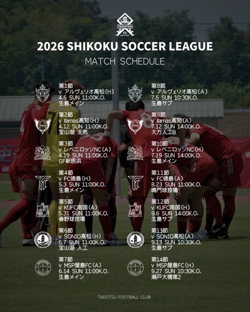 日頃より多度津FCへの熱きご支援、ご声援誠にありがとうございます。 2026シーズン四国社会人サッカーリーグの試合日程が決定しましたのでお知らせします。 多...