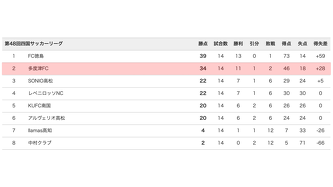 今シーズンのリーグ成績は、11勝2敗1分、勝ち点34、得点46、失点18、得失点差+28という成績で、四国リーグ参入から13シーズン目にして最高の2位を収めることができました。