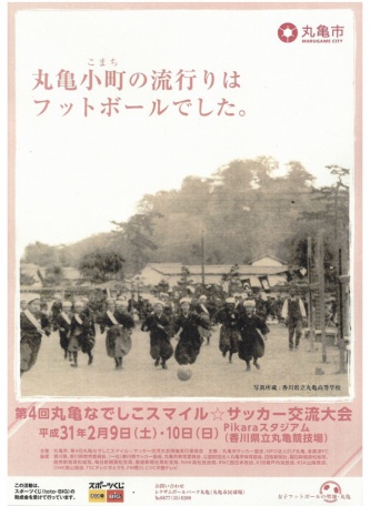 丸亀市では、平成23年に丸亀高等女学校の女子生徒がフットボールをしている大正時代の絵葉書が発見され、これが日本で現在確認されている最も古い女子サッカーの記録であることを契機に「なでしこ発祥の地・丸亀」として、女子サッカーの普及に取り組んでいるところです。