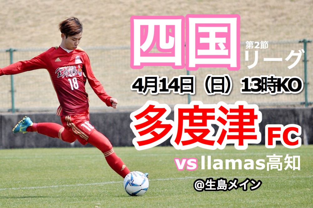 【試合情報】2019四国社会人サッカーリーグ 第2節 vs llamas高知 2019年04月10日 日頃は多度津フットボールクラブにご支援いただきまして誠にありがとうございます。 次節試合日程をお知らせします。 【試合日程】 【2019四国社会人サッカーリーグ 第2節】 【日時】4月14日(日)13:00キックオフ 【対戦カード】 多度津FC vs llamas高知 【会場】香川県総合運動公園 生島メイン 四国リーグ第2節です。 連敗を阻止するための非常に大切な1戦となります。 是非会場での応援よろしくお願いいたします。