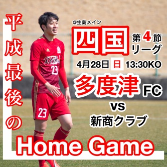 【試合情報】2019四国社会人サッカーリーグ 第4節 vs 新商クラブ 2019年04月26日 日頃は多度津フットボールクラブにご支援いただきまして誠にありがとうございます。 次節試合日程をお知らせします。 【試合日程】 【2019四国社会人サッカーリーグ 第4節】 【日時】4月28日(日)13:30キックオフ 【対戦カード】 多度津FC vs 新商クラブ 【会場】香川県総合運動公園 生島メイン 平成最後の多度津FCホームゲームで 平成最後の3連勝をかけ 平成最後の戦いに臨みたいと思います。 平成最後の応援よろしくお願い致します。