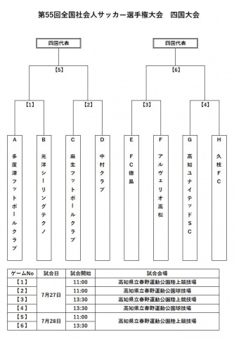 【試合情報】全国社会人サッカー選手権大会四国予選組み合わせ決定 2019年07月17日 日頃より、多度津フットボールクラブへの熱きご支援、ご声援誠にありがとうございます。 第55回全国社会人サッカー選手権大会四国大会の組合せが決定しましたのでお知らせします。 初戦は7月27日(土)11:00キックオフ、高知県立春野陸上競技場にて光洋シーリングテクノ様と対戦。 勝てば、7月28日(日)11:00キックオフ、高知県立春野陸上競技場にて、麻生フットボールクラブ様と中村クラブ様の勝者と代表決定戦を行います。 応援よろしくお願いします。