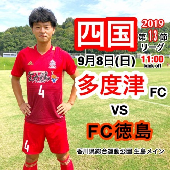 【試合情報】2019四国社会人サッカーリーグ 第13節 vs FC徳島 2019年09月07日 日頃は多度津フットボールクラブにご支援いただきまして誠にありがとうございます。 次節試合日程をお知らせします。 【試合日程】 【2019四国社会人サッカーリーグ 第13節】 【日時】9月8日(日)11:00キックオフ 【対戦カード】 多度津FC vs FC徳島 【会場】香川県総合運動公園 生島メイン 今シーズンのホーム最終戦になります。 良い結果が残せるよう全力で戦いたいと思います。 ぜひ会場での応援よろしくお願いします。