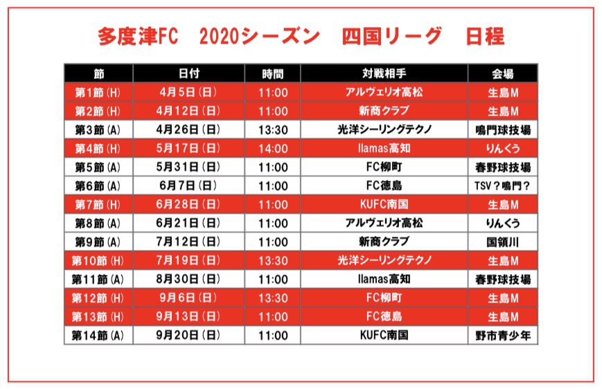 2020年度 第44回四国社会人サッカーリーグ日程発表 2020年02月06日 日頃より多度津フットボールクラブへの熱きご支援、ご声援ありがとうございます。 2020四国社会人サッカーリーグの試合日程が決定しましたのでお知らせします。 多度津フットボールクラブの初戦は4月5日(日)11:00キックオフ、香川県総合運動公園 生島メインにてアルヴェリオ高松と対戦です。 2020シーズンも皆様の熱きご声援よろしくお願いします。
