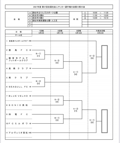 第57回全国社会人サッカー選手権大会 香川県予選組み合わせのお知らせ。 2021年03月20日 日頃より多度津フットボールクラブへの熱きご支援、ご声援誠にありがとうございます。 第57回全国社会人サッカー選手権大会香川県大会の組み合わせが決定しておりますのでお知らせします。 当クラブは5月23日(日)の代表決定戦が初戦となっております。 天皇杯香川県予選、四国リーグ、そして全社と試合が続きます。 上位進出を目指し戦います。 応援よろしくお願いします。