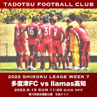 【試合情報】2022四国社会人サッカーリーグ 第7節 vs llamas高知【H】 2022年06月18日 日頃より多度津FCへの熱きご支援、ご声援誠にありがとうございます。 【2022四国社会人サッカーリーグ 第7節】 【日時】6月19日(日)11:00キックオフ 【会場】香川県総合運動公園 生島メイン 【対戦相手】llamas高知 6月3連戦、第3戦。 早くも前期最終節になります。 後期への巻き返しのためにも負けられない戦いです。 基本的な感染対策の上、会場での皆様の熱きご声援よろしくお願いいたします。 皆様の熱きご声援よろしくお願いいたします。